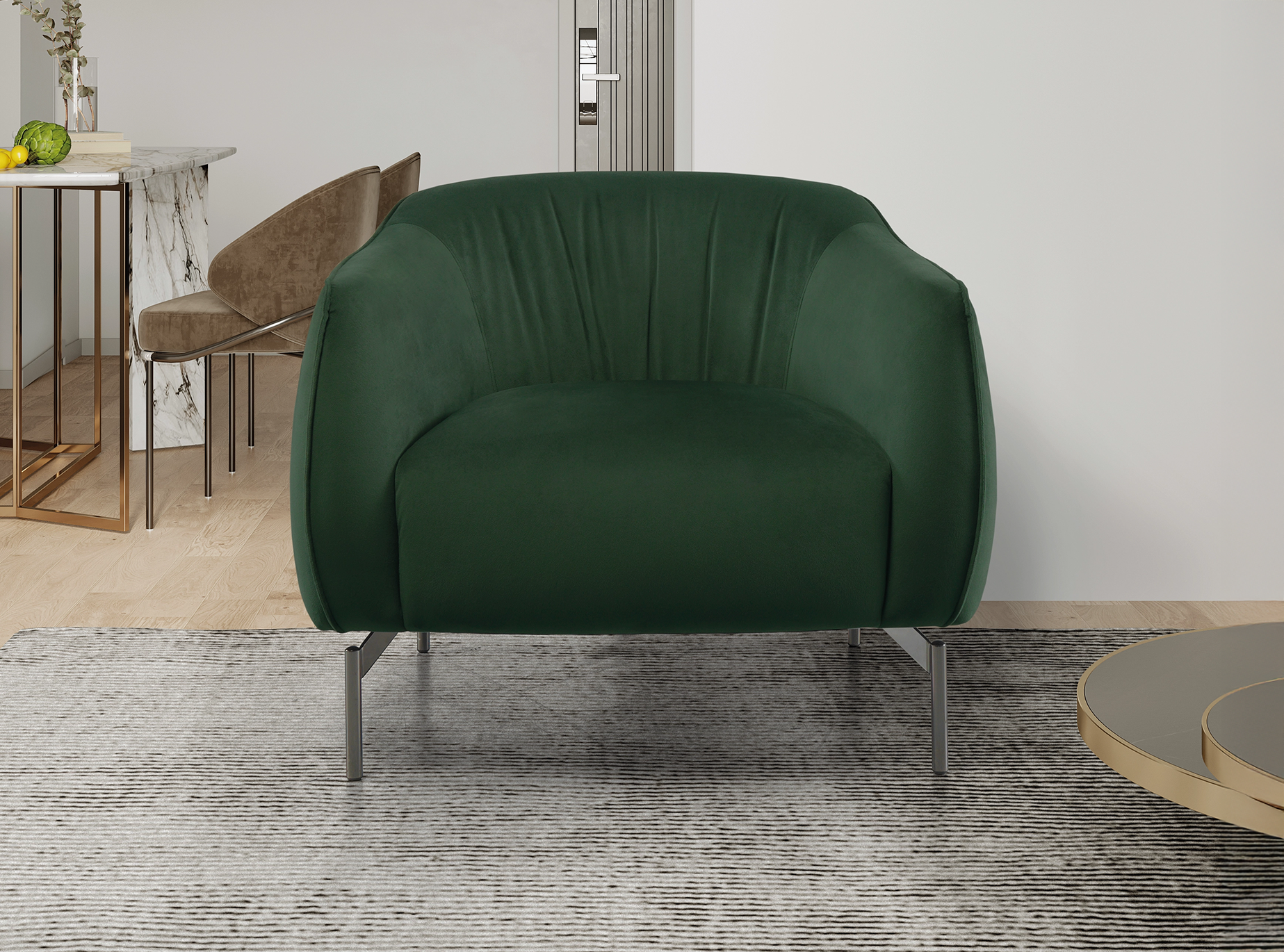 O cadeirão Adisa combina linhas minimalistas com um conforto robusto. O pé metálico alto em níquel negro confere leveza e sofisticação, enquanto o corpo estofado transmite solidez, tornando-se a escolha ideal para espaços modernos e acolhedores.