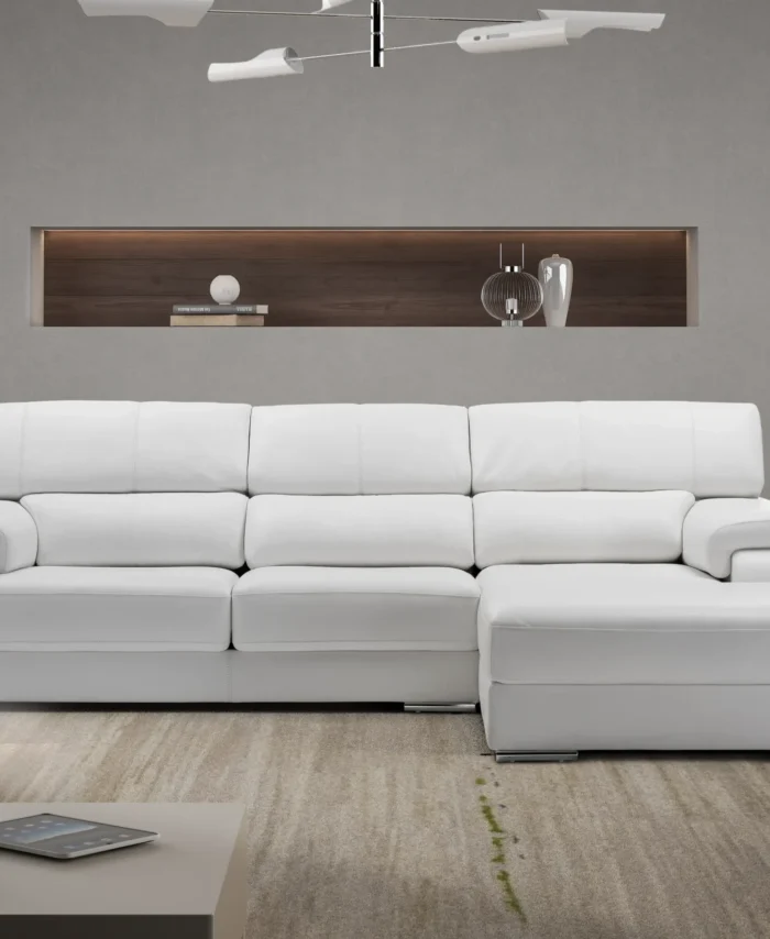 Estrutura em madeira de pinho e MDF, revestida em espuma de 23kg/m3 e fibra acrílica;