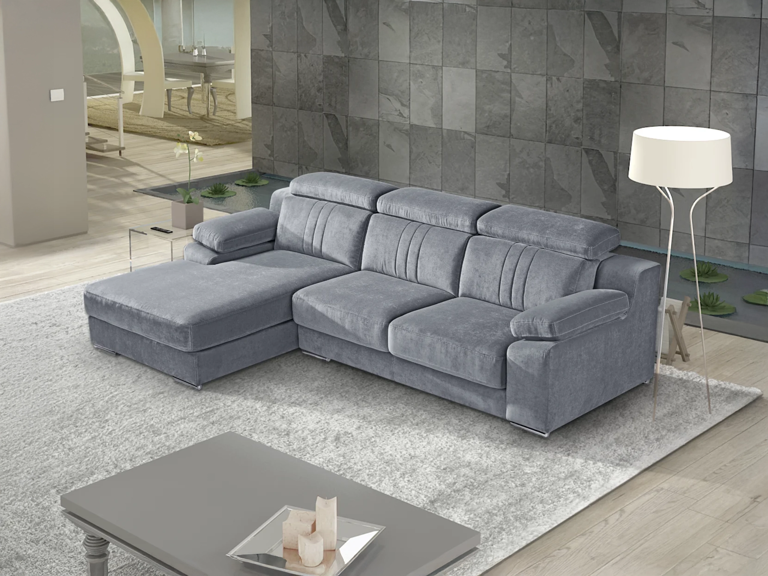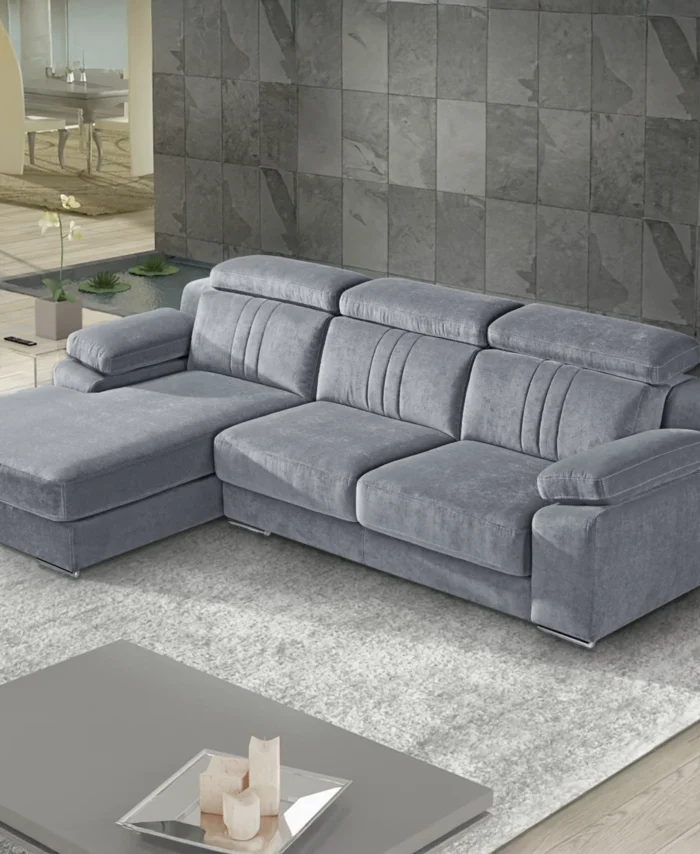 Estrutura em madeira de pinho e MDF, revestida em espuma de 23kg/m3 e fibra acrílica;