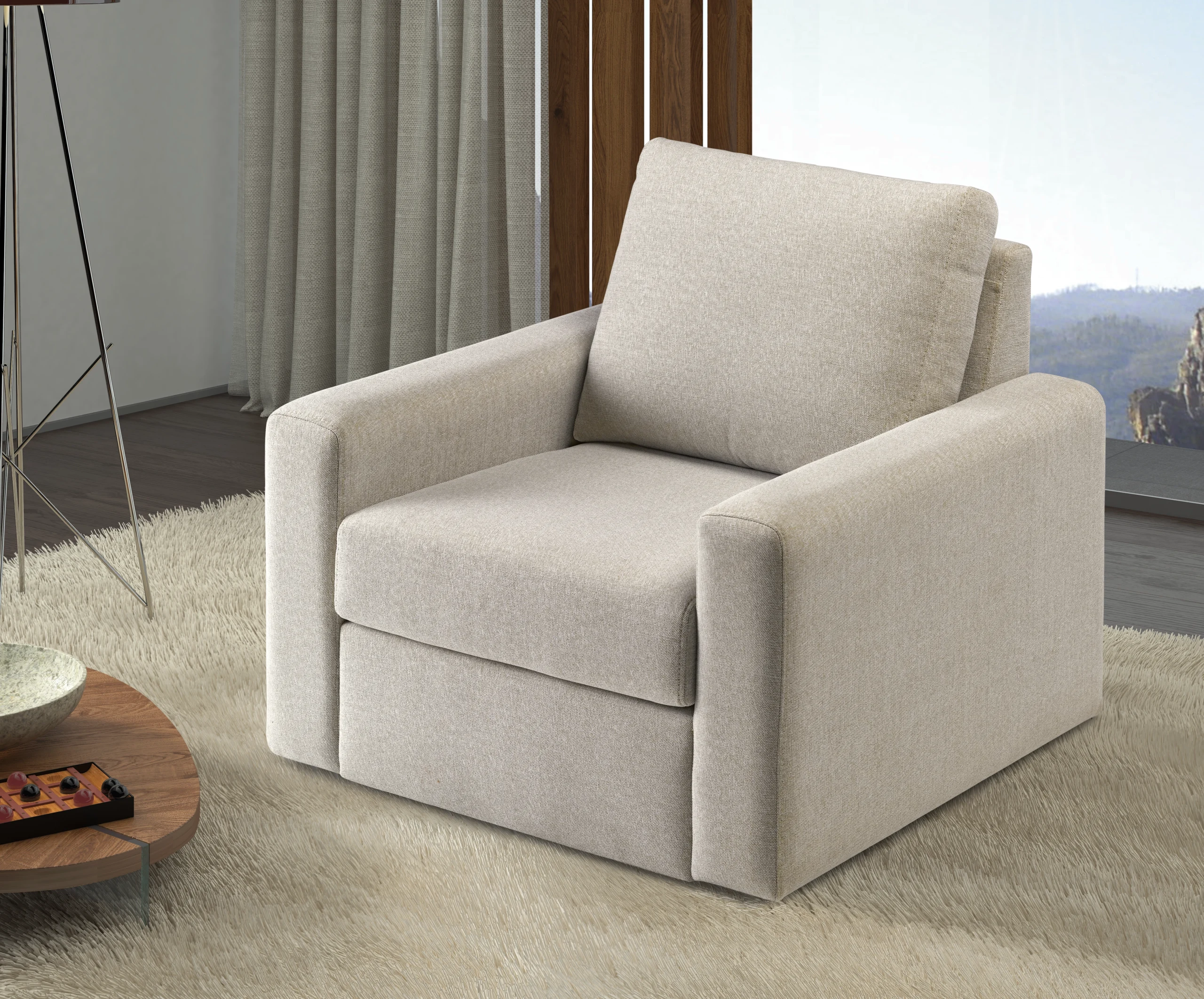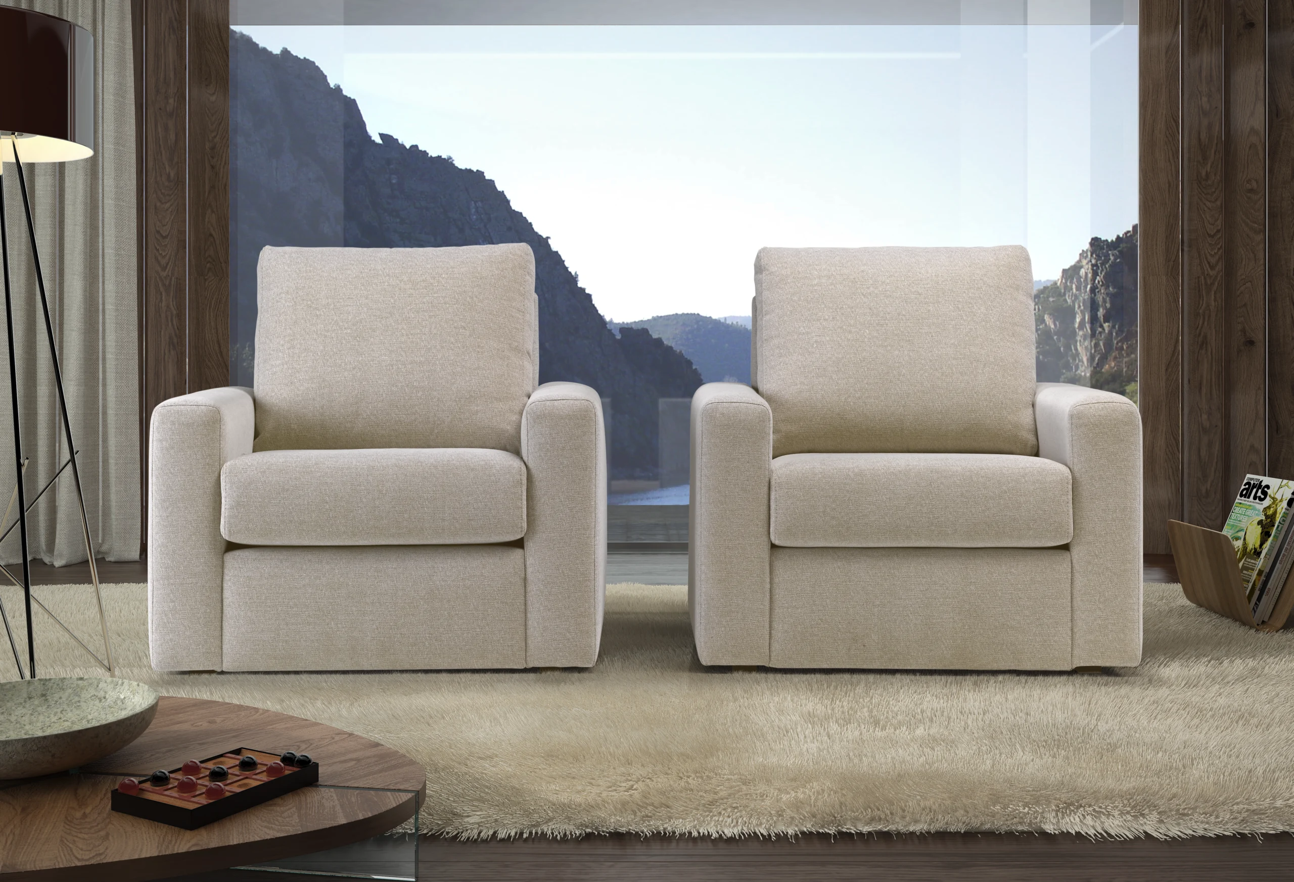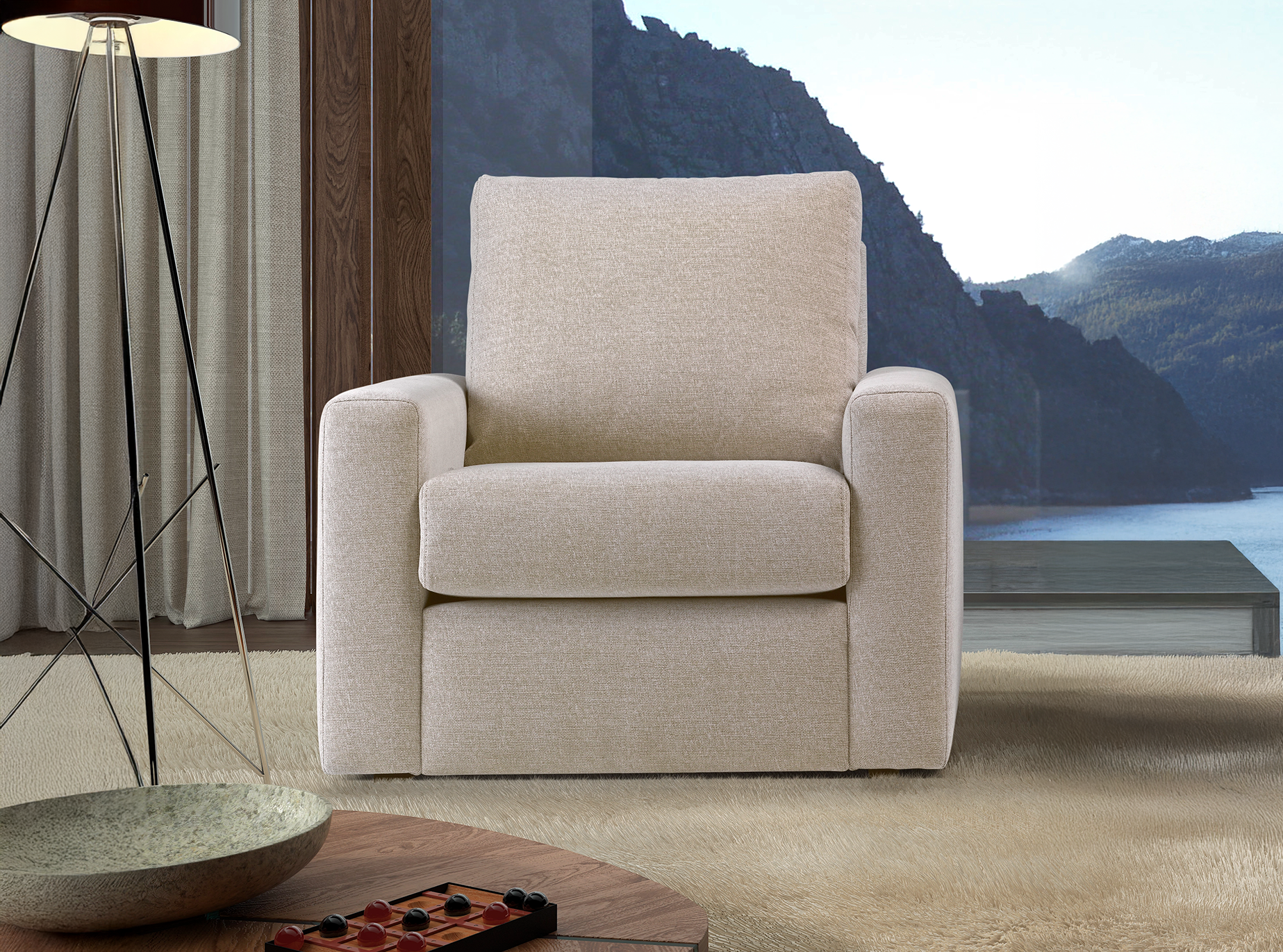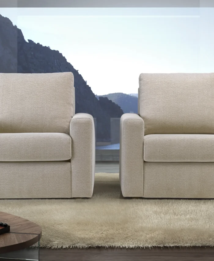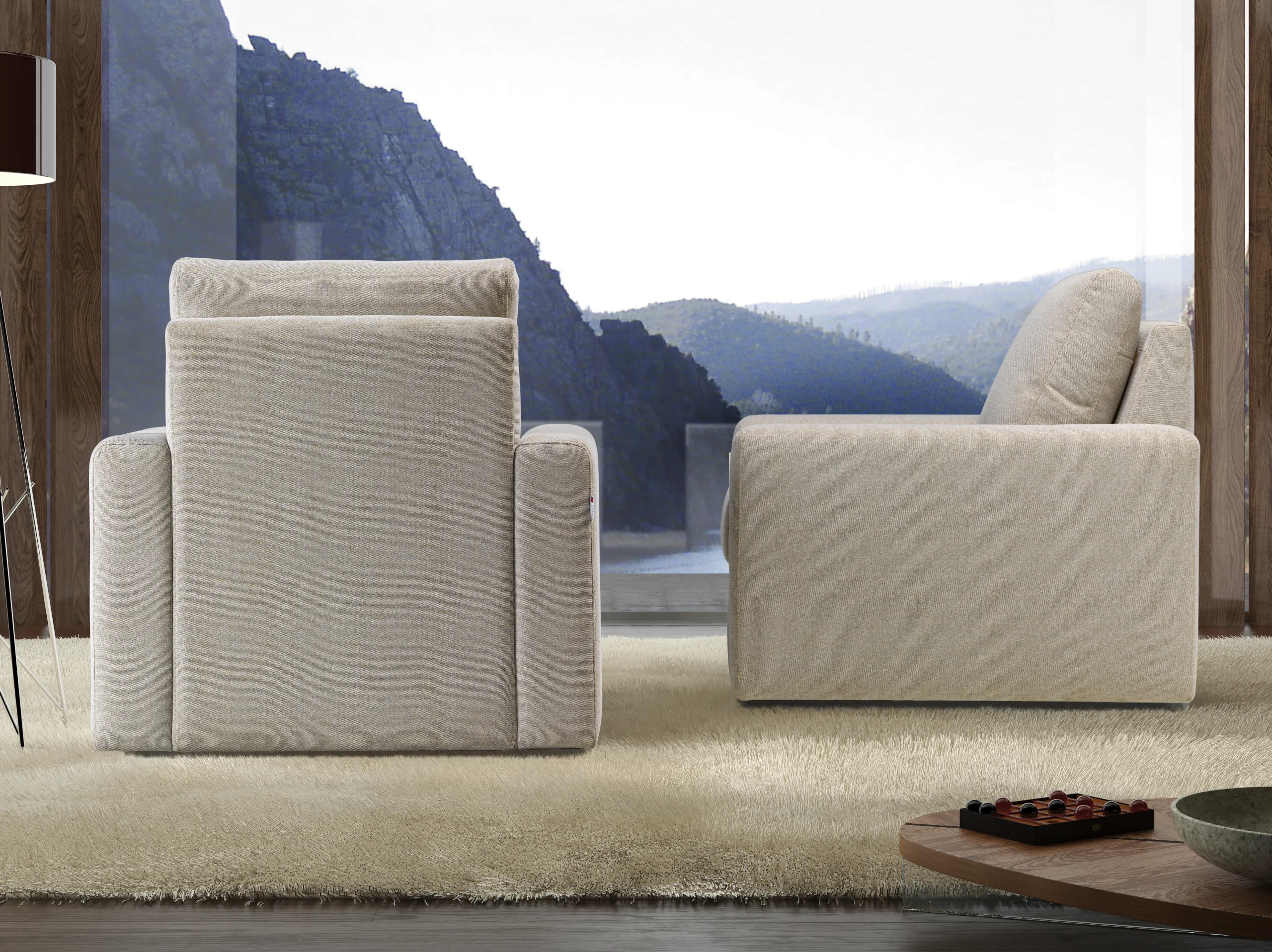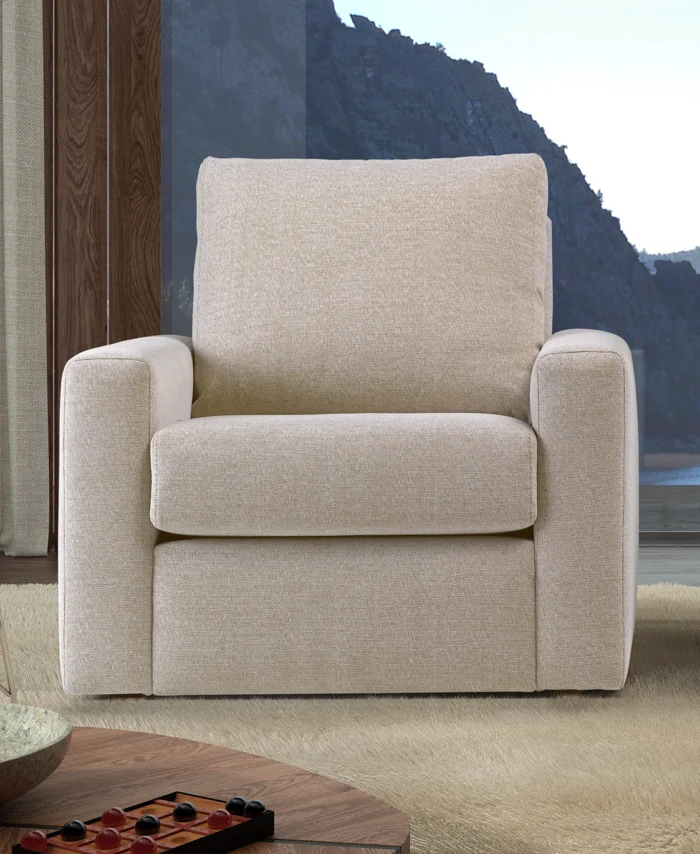 A estrutura em madeira de pinho e MDF, totalmente revestida em espuma de 23kg/m³ e fibra acrílica, assegura resistência e suavidade. O assento removível em espuma HR de 35kg/m³ garante firmeza com durabilidade, enquanto o encosto com enchimento em comforel proporciona suavidade ergonómica e aconchego extra.