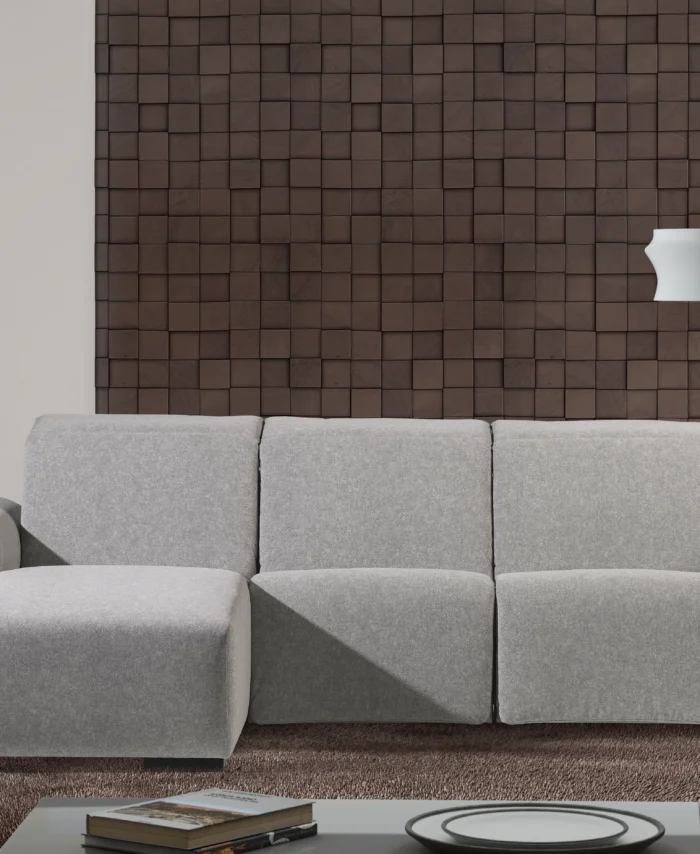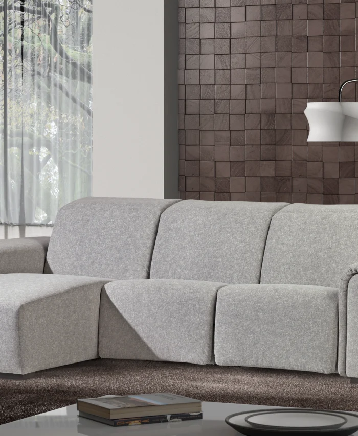 Estrutura em madeira de pinho e MDF, revestida em espuma de 23kg/m3 e fibra acrílica;