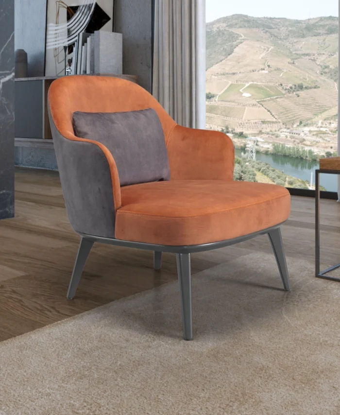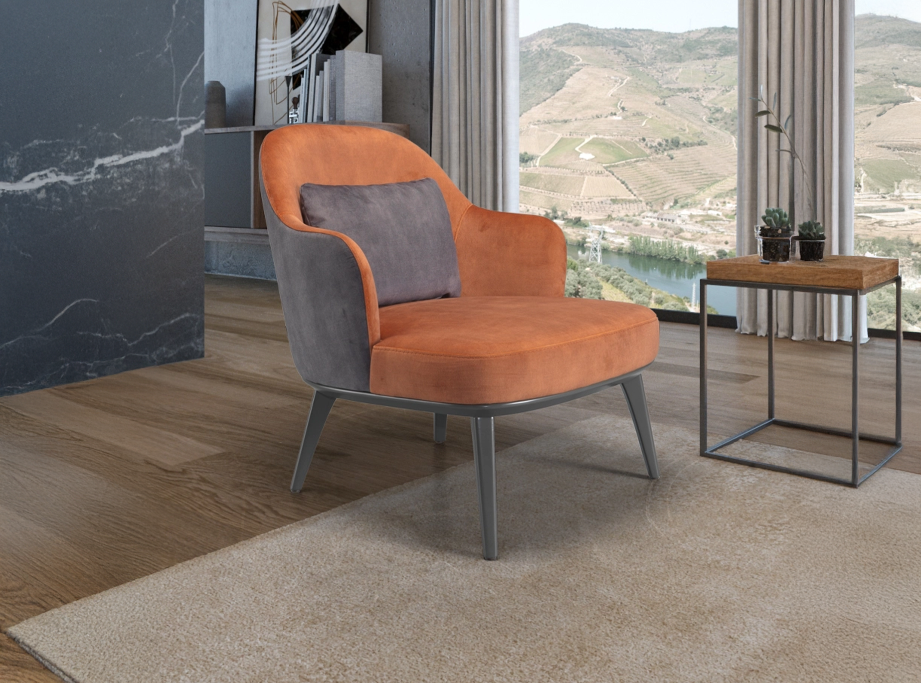 O cadeirão Onna alia curvas envolventes a uma presença marcante. O contraste entre tons e a suavidade das formas criam uma peça versátil, que tanto pode ser o destaque de uma sala moderna como um complemento elegante em ambientes mais discretos.