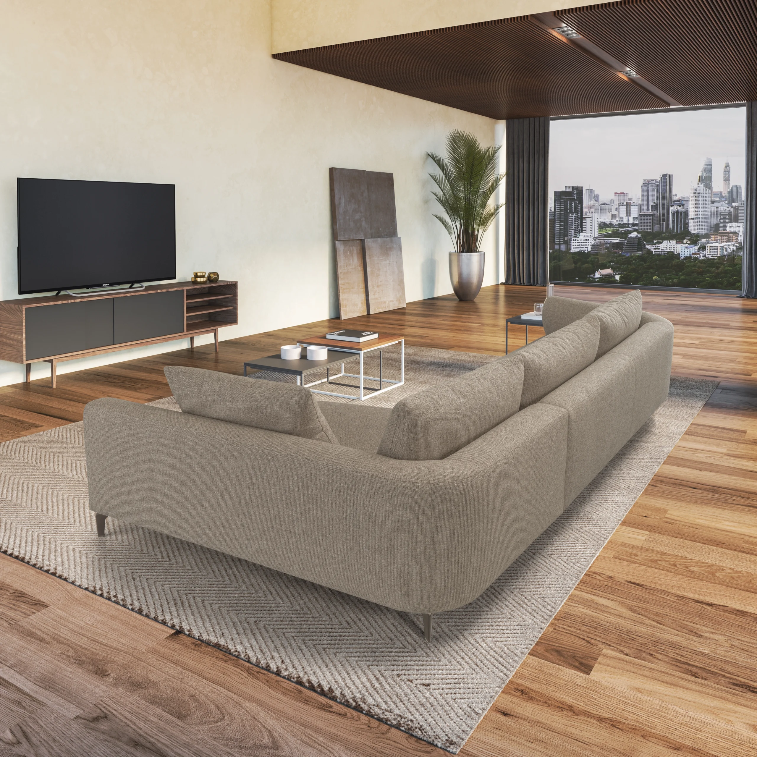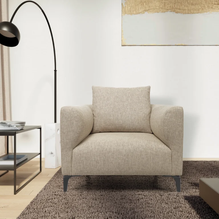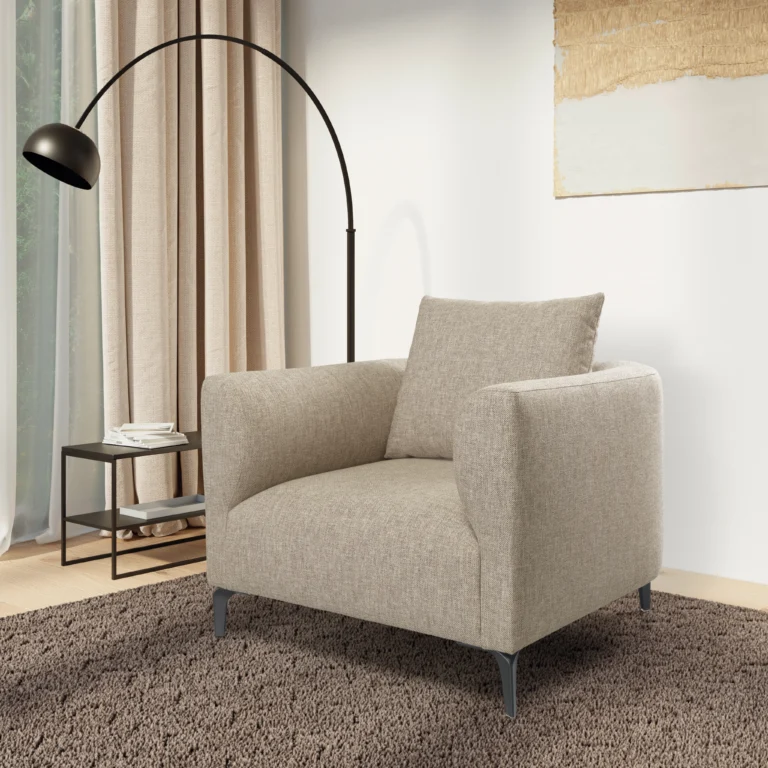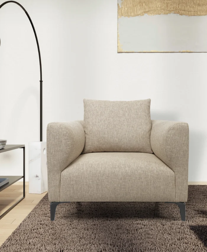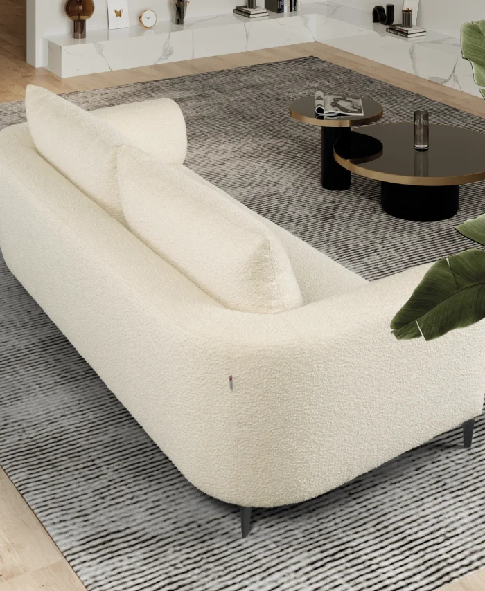A estrutura interna é feita em madeira de pinho tratado, com cintas elásticas de alto teor de borracha que garantem suporte e conforto. Os assentos usam espumas de alta resiliência com revestimento em fibra acrílica, e as almofadas das costas, feitas com mistura de microfibra reciclada e penas de pato, proporcionam um apoio macio, acolhedor e durável. Os revestimentos das costas são totalmente removíveis para facilitar a limpeza.