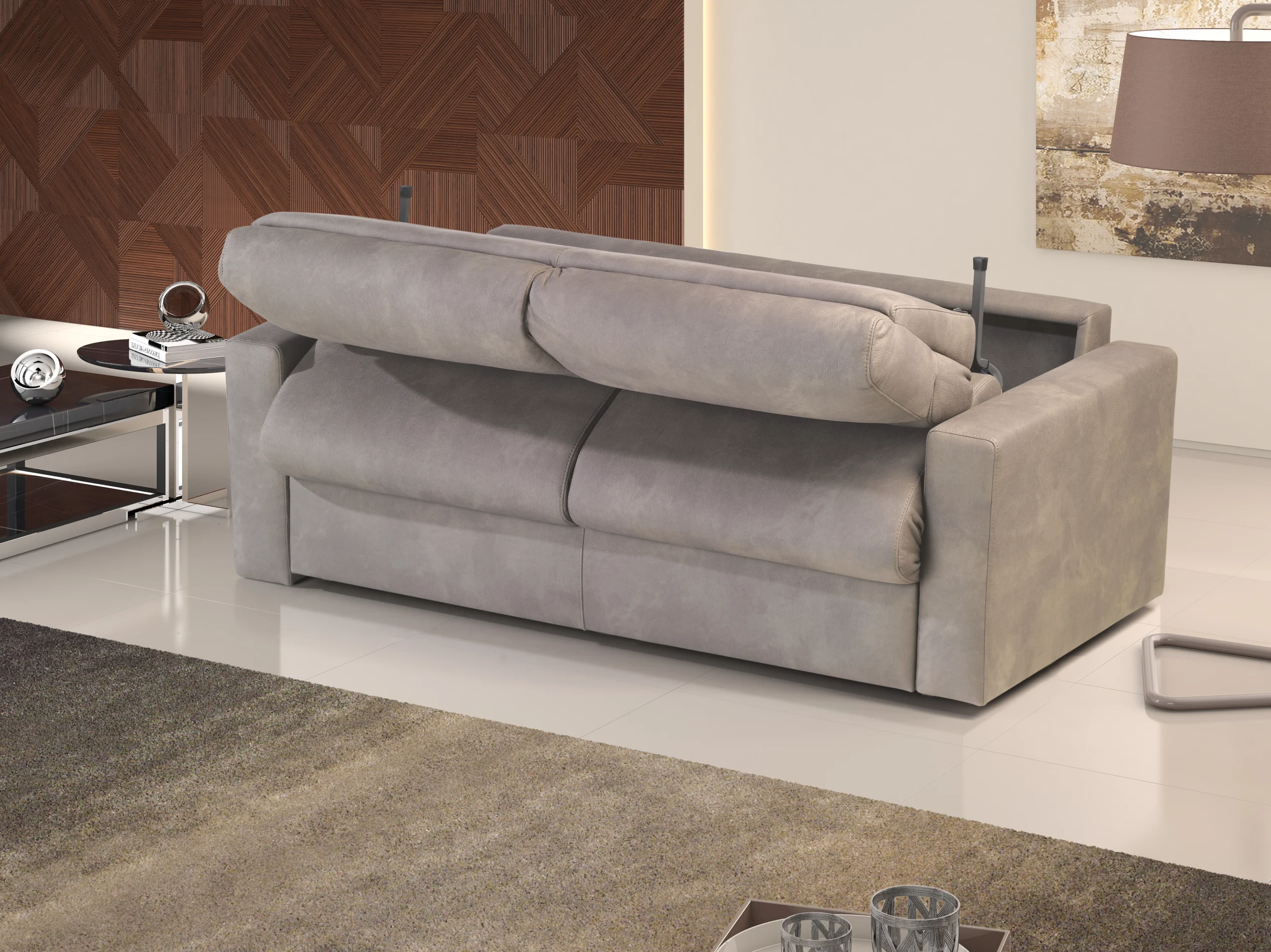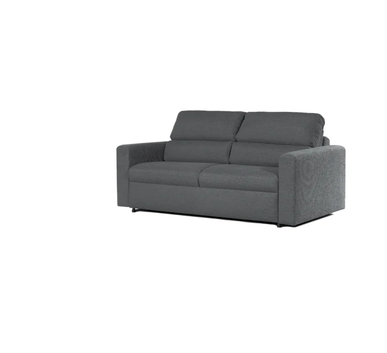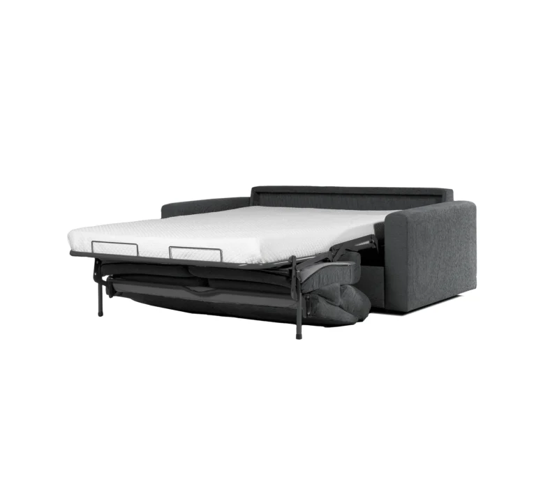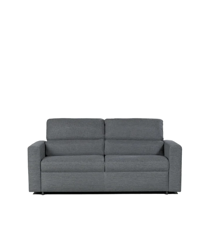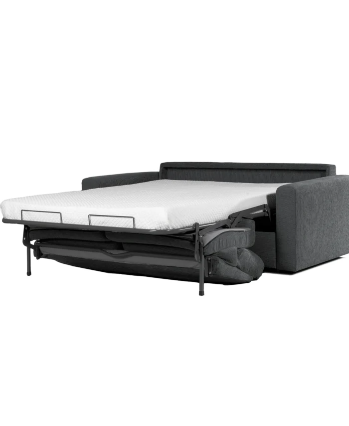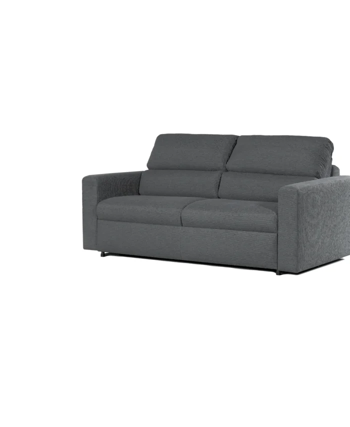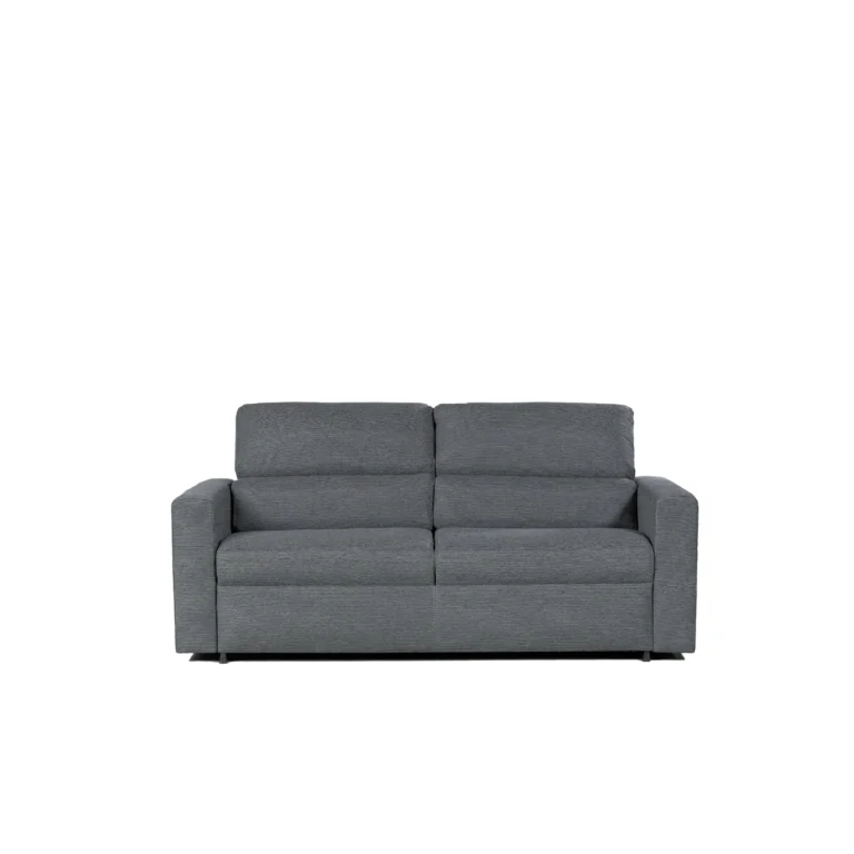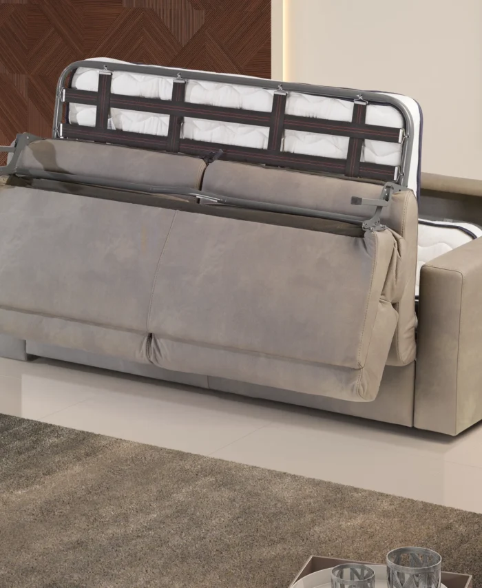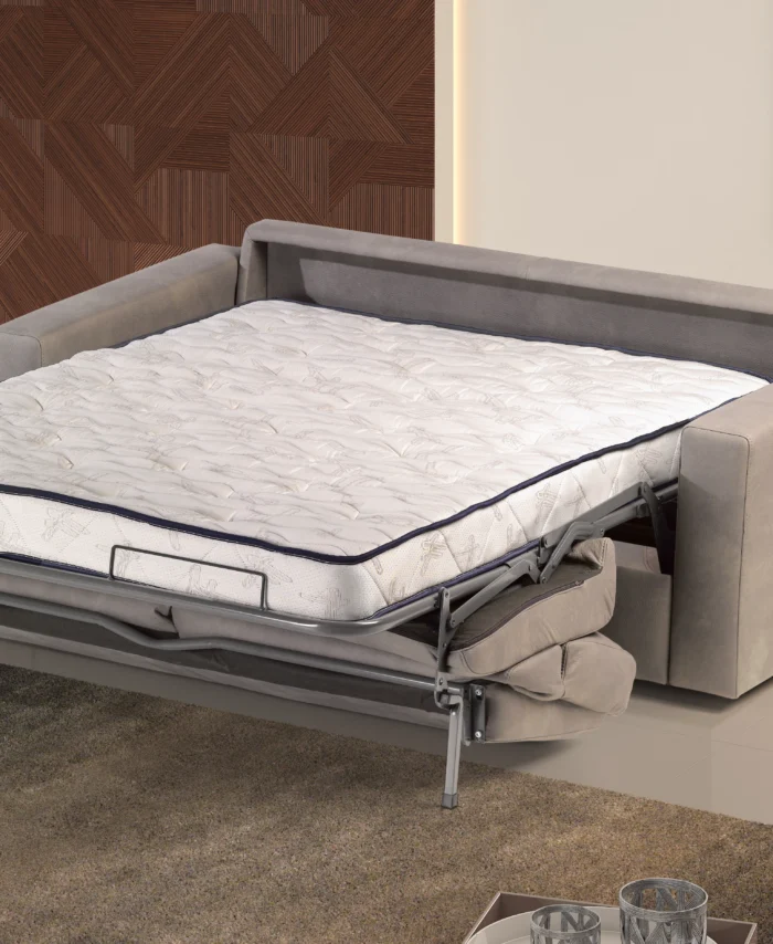 A sua estrutura em madeira de pinho e MDF, revestida em espuma e fibra acrílica, oferece robustez e durabilidade. Os assentos em espuma HR de alta resiliência (35kg/m³) e as almofadas de encosto em conforel asseguram um conforto diário, enquanto o colchão de 12 cm de altura proporciona um descanso de qualidade quando o sofá se transforma em cama. O mecanismo manual permite a abertura fácil e prática, tornando a experiência intuitiva e sem esforço.
