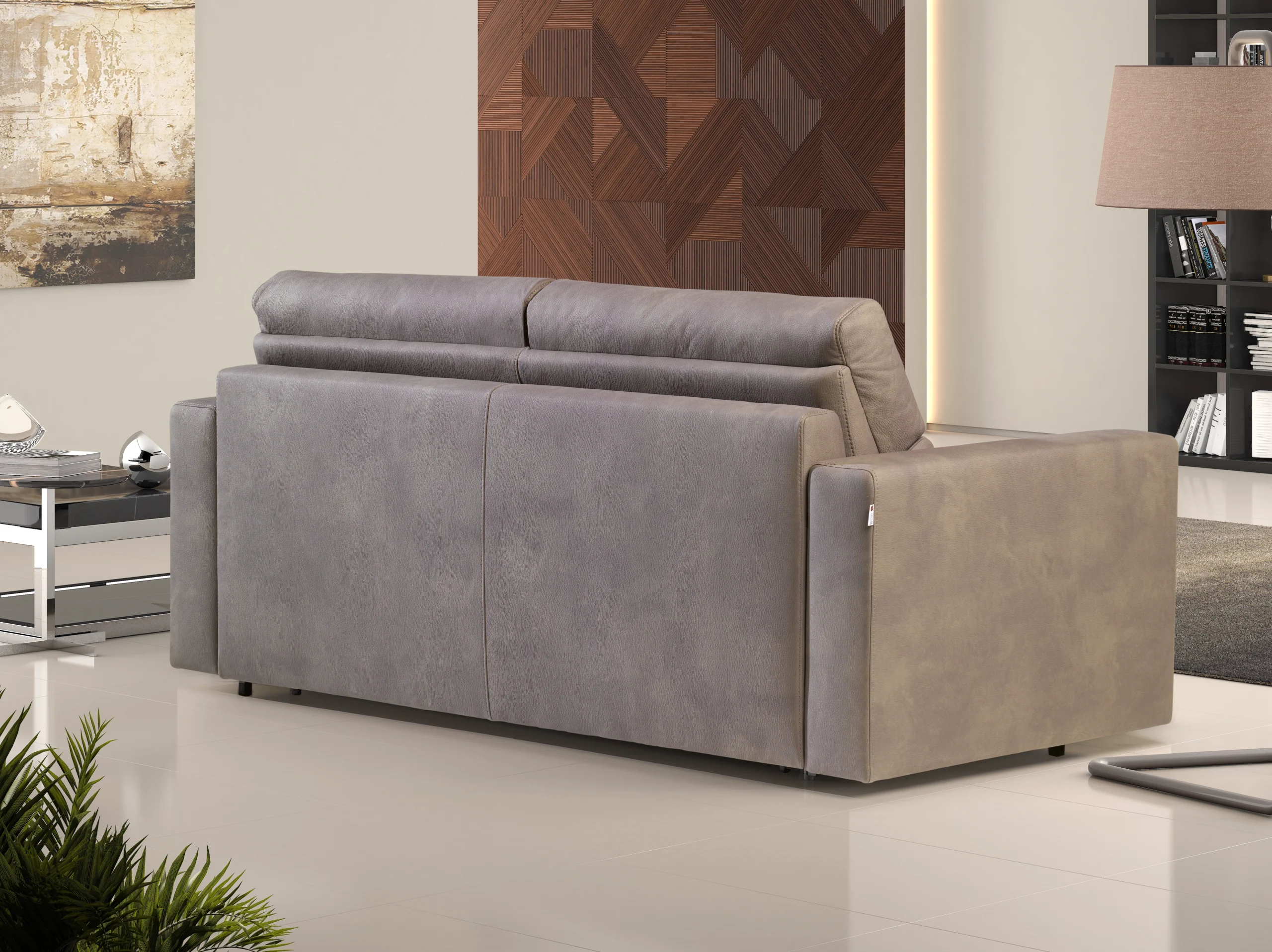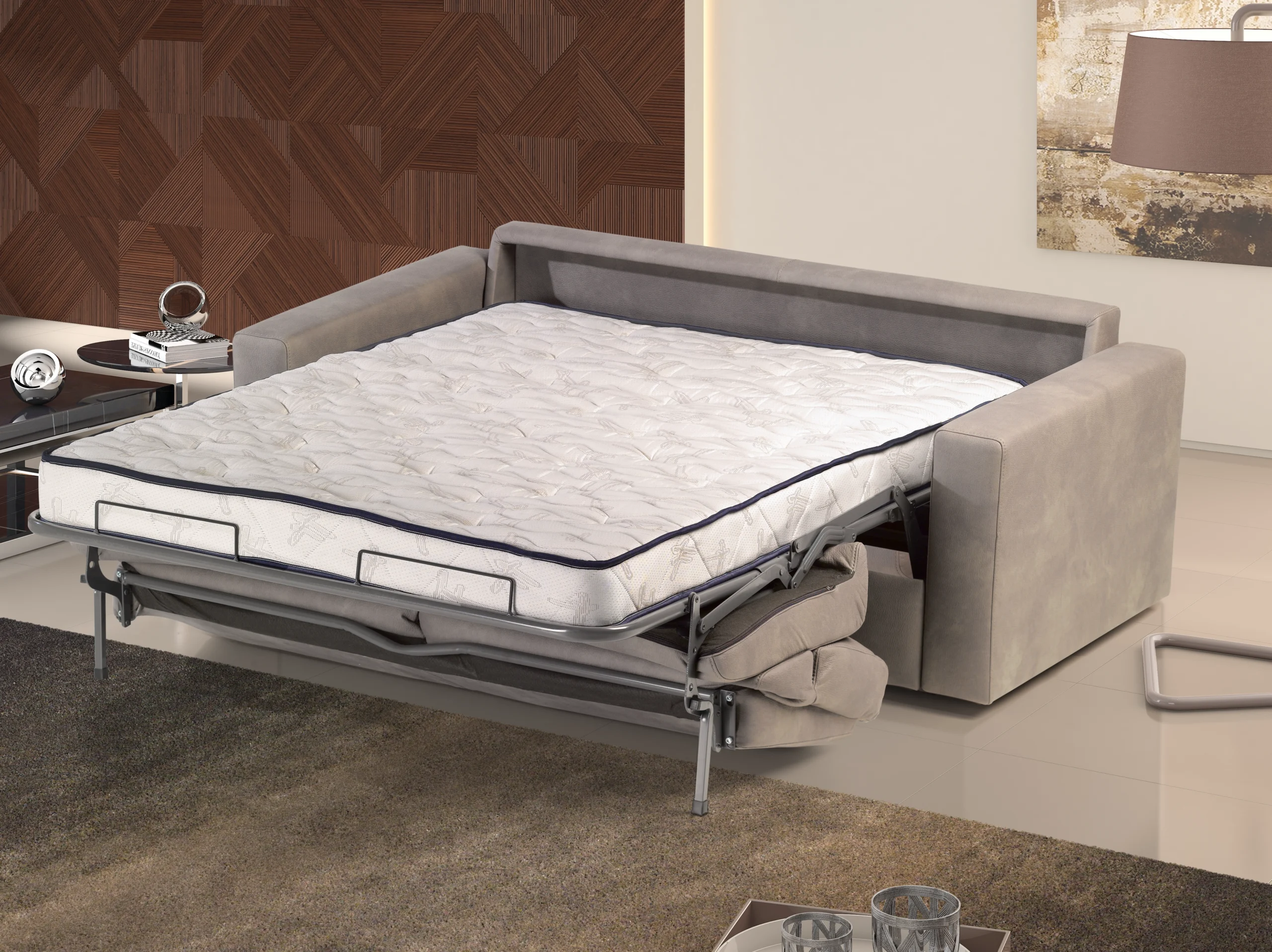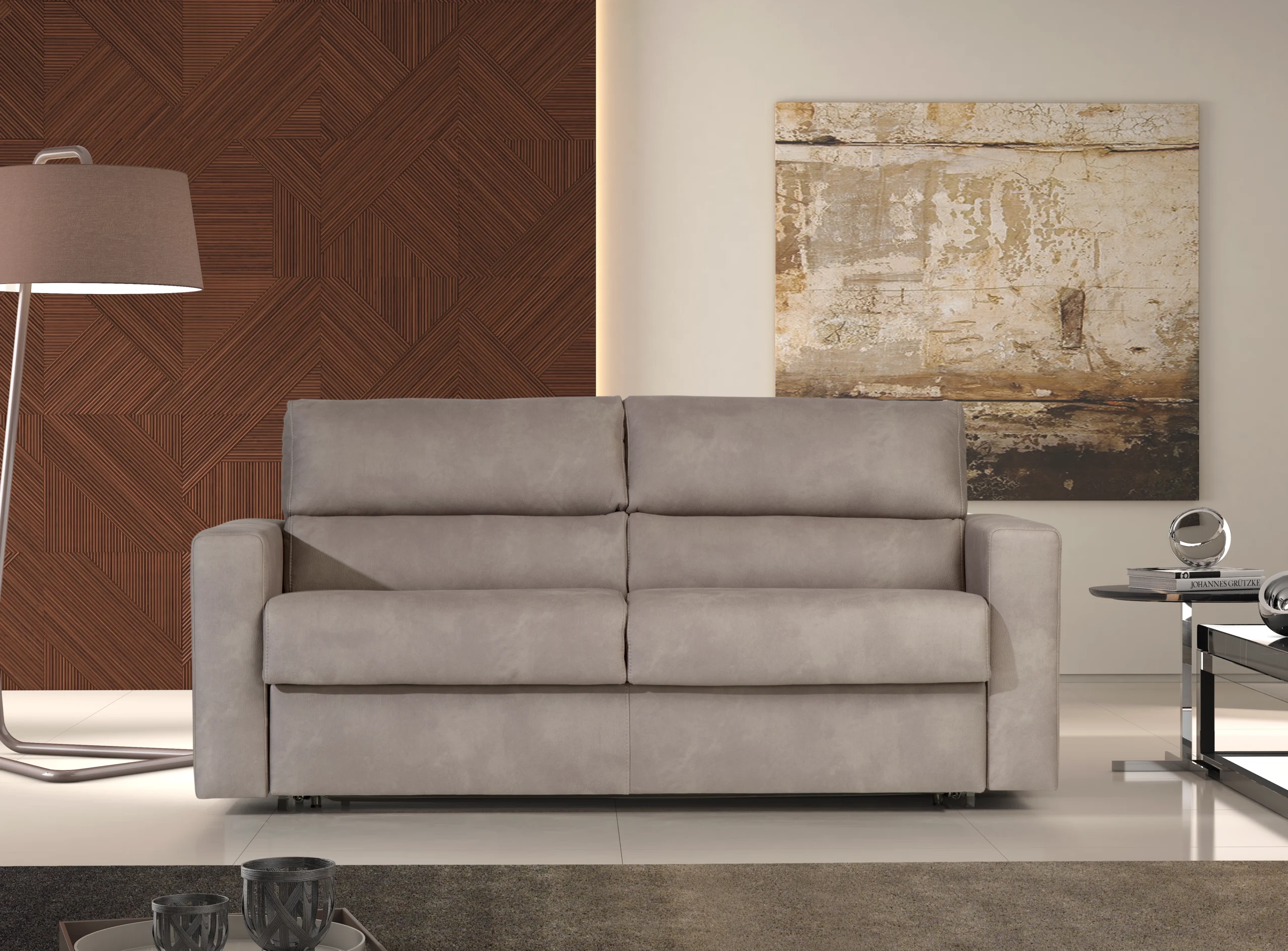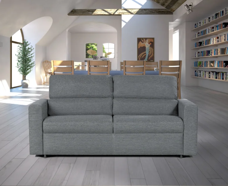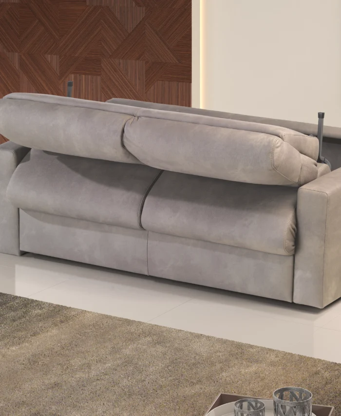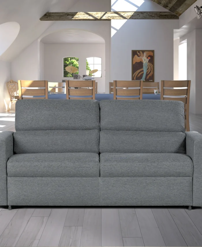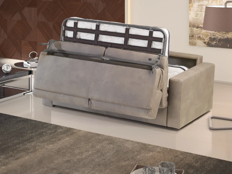 A sua estrutura em madeira de pinho e MDF, revestida em espuma e fibra acrílica, oferece robustez e durabilidade. Os assentos em espuma HR de alta resiliência (35kg/m³) e as almofadas de encosto em conforel asseguram um conforto diário, enquanto o colchão de 12 cm de altura proporciona um descanso de qualidade quando o sofá se transforma em cama. O mecanismo manual permite a abertura fácil e prática, tornando a experiência intuitiva e sem esforço.